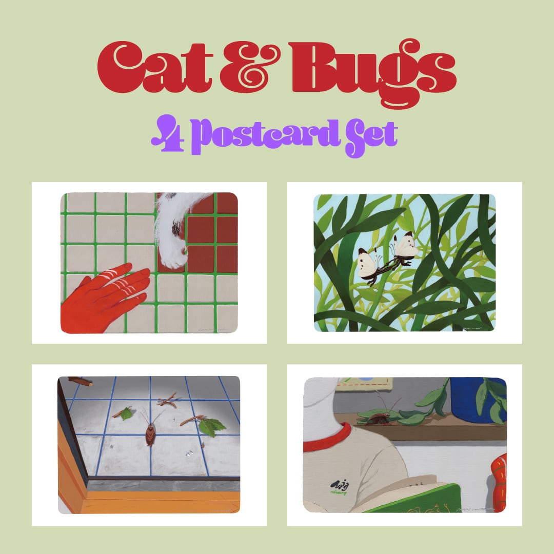 「マナー違反だ」(ネコと人間)、「疑念の残るダンス」(蝶)、「律儀な挨拶」(ゴキブリ)、「読書の拝借」(ゴキブリ)をポストカードにしました。